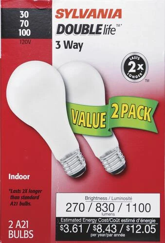 The most common applications for the Sylvania® 30/70/100-Watt A21 Double Life Three-Way Dimmable Incandescent Light Bulbs are in general use locations. These light bulbs come in a convenient two pack and have a CRI of 100.