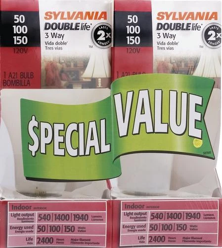 The most common applications for the Sylvania® 50/100/150-Watt A21 Double Life Three-Way Dimmable Incandescent Light Bulbs are in general-use locations. These light bulbs come in a convenient two pack and have a CRI of 100.